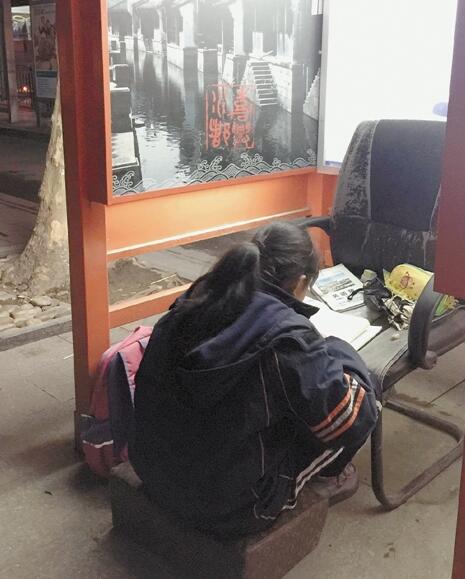 照片上這個四面漏風(fēng)的電話亭,是嘉興12歲女孩曉華的“書房”,一把舊椅子當(dāng)書桌,沙發(fā)坐墊當(dāng)?shù)首?,每天借著昏暗的照明燈看書做作業(yè)。