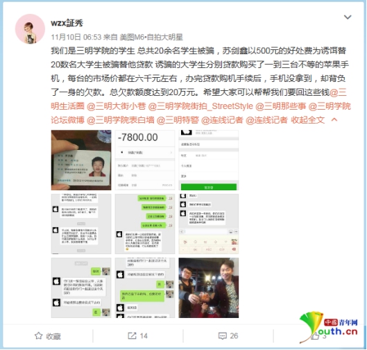 近日福建三明學(xué)院有學(xué)生發(fā)微博稱,自己與多名同學(xué)被誘騙貸款買手機(jī),辦完貸款購機(jī)手續(xù)后,手機(jī)沒拿到卻背了一身債務(wù)。20名大學(xué)生總欠款額度達(dá)20多萬。