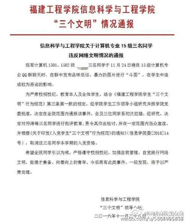 這份經(jīng)福建工程學(xué)院有關(guān)教職人員證實(shí)的《通報(bào)》稱,現(xiàn)有計(jì)算機(jī)1501、1502班XXX等三名學(xué)生于11月24日晚在15級(jí)計(jì)算機(jī)專業(yè)QQ群聊天時(shí),在群中發(fā)布品位低俗、暴力的圖片進(jìn)行“斗圖”,在學(xué)生中造成較為惡劣的影響。