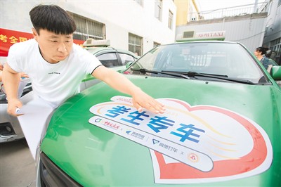 網(wǎng)絡(luò)出行平臺(tái)高德打車聯(lián)合有關(guān)方面推出“愛心送考 ”免費(fèi)服務(wù)。圖為參與提供服務(wù)的工作人員給車貼相關(guān)標(biāo)識。