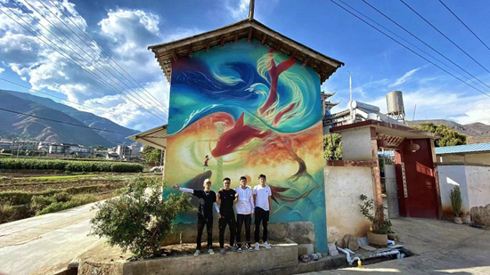 劉小備(左一)和團(tuán)隊(duì)伙伴在墻繪前合影。受訪者供圖