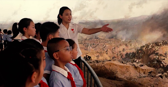 遼沈戰(zhàn)役紀念館講解員姚璐璐在全景畫館為小學(xué)生講述戰(zhàn)斗故事。