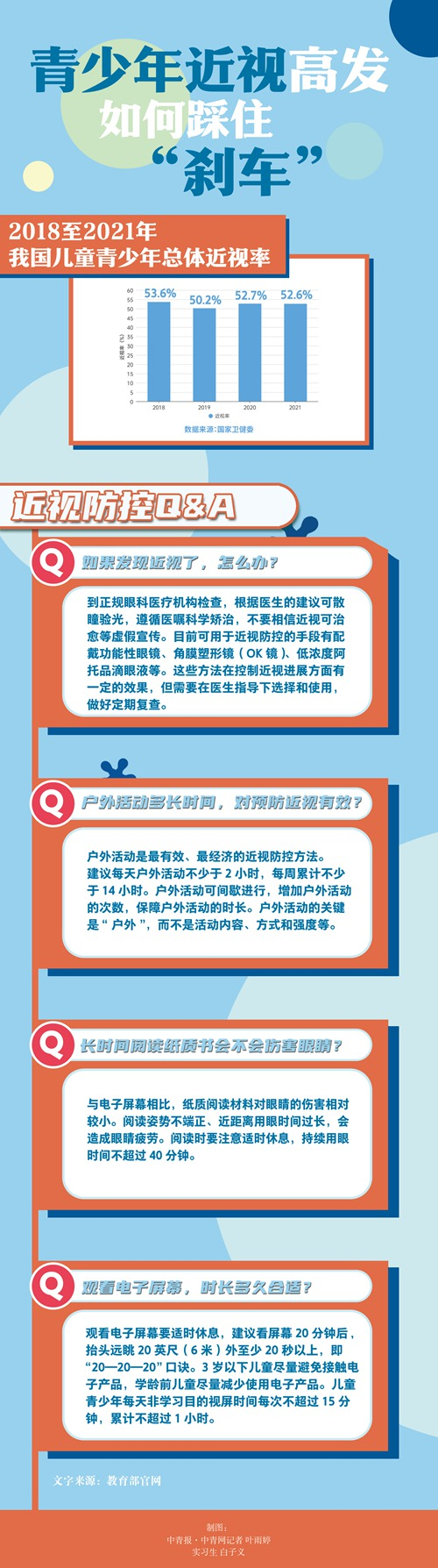 而在溫州醫(yī)科大學眼視光醫(yī)學部主任、教育部近視綜合防控專家宣講團團長瞿佳看來,從總體上說,我國近視防控的確取得了標志性的進展。“最重要的就是我們的近視率下降了,從2018年的53.6%到2021年的52.6%,下降了一個百分點?!薄捌鋵?,這幾年的疫情極大干擾了近視防控工作的正常進行?!宾募迅嬖V中青報·中青網(wǎng)記者,孩子們宅在家里上網(wǎng)課,活動少了,走到戶外也少了,電子產(chǎn)品的使用卻更多了,而家長對孩子近視管控的力度也不如學校。