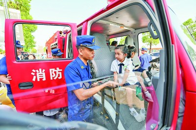 最近,各地學校陸續(xù)開啟新學期。圖為8月31日,在四川省眉山市彭山區(qū)學院路幼兒園,眉山市彭山區(qū)消防救援大隊的消防員為小朋友們介紹消防車上的裝備。新華社記者 王曦攝