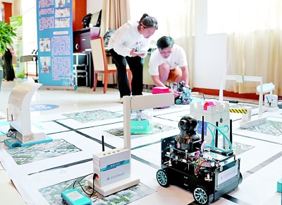 上海電子信息職業(yè)技術(shù)學(xué)院的師生展示智能機(jī)器人創(chuàng)新開發(fā)項(xiàng)目。 新華社發(fā)