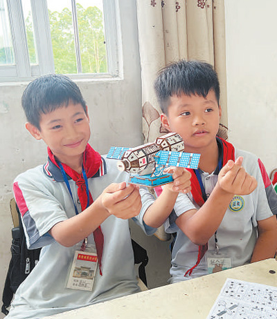 “這是航天衛(wèi)星的兩翼,是安裝太陽(yáng)能電池板的地方?!眮碜詮V西壯族自治區(qū)梧州市藤縣第五小學(xué)的三年級(jí)學(xué)生李杰峰驕傲地展示著親手組裝的模型,他希望將來能從事航天工作。