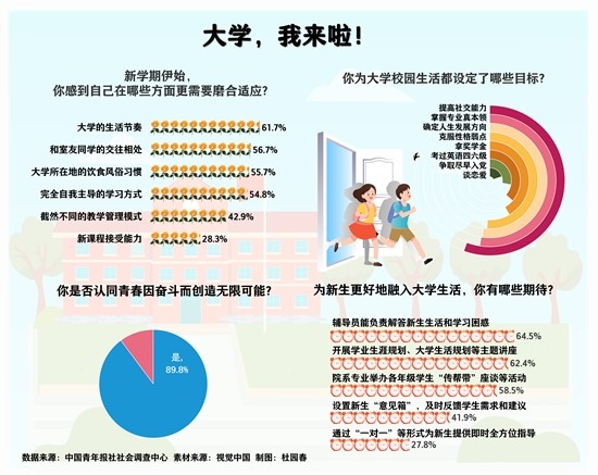 開學季,大一新生陸續(xù)報到,開啟了全新的校園生活。人際交往、學習氛圍、生活方式……各方面都需要去探索和適應。面對嶄新的人生階段,他們準備好了嗎?他們?yōu)樽约旱拇髮W設立了什么目標?