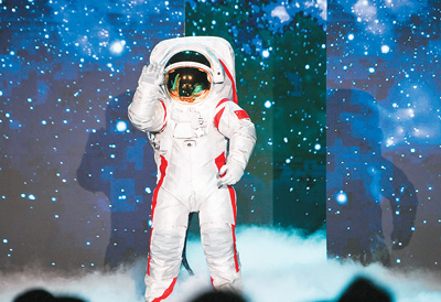登月服主體的金屬光澤科技感十足,上下肢紅色裝飾帶增強了視覺上的力量感和修身效果。上肢裝飾帶設計為優(yōu)雅飄逸的“飛天”飄帶造型,下肢裝飾帶則設計成火箭升空尾焰造型,形成了一飛沖天的勢態(tài)。