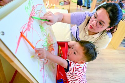 在江蘇省南京一家托育中心,一名小朋友在托育老師的陪伴下畫畫。新華社發(fā)