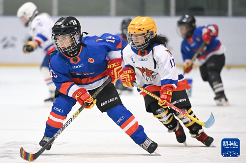 1月25日,在齊齊哈爾市的黑龍?bào)w育館內(nèi),二馬路小學(xué)翼虎冰球隊(duì)隊(duì)員劉金梓晨(左)在訓(xùn)練中。新華社記者 張濤 攝