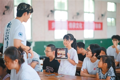 湖南省懷化市通道侗族自治縣萬佛山鎮(zhèn)木腳村,大學生在給孩子們上趣味AI實驗課。李尚引攝(人民視覺)
