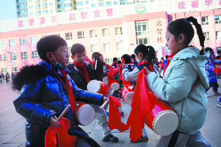 作為一種歷史悠久的傳統(tǒng)民族藝術,腰鼓節(jié)奏歡快,鼓聲清脆悅耳。由孩子們展示這種藝術形式,更能張揚出獨特的藝術性,同時練招式、講秩序,長知識、練思辨。由來自全校的100名學生組成的腰鼓隊是市實驗小學精心打造的一支規(guī)模相對較大的隊伍。董海燕老師是腰鼓隊的三位帶隊老師之一,還兼任198班的班主任,緊張的課堂教學之余,還要積極參與到教孩子們打腰鼓的第二課堂活動中,董老師說,下一步,學校準備打造千人腰鼓隊,讓更多的孩子了解和掌握打腰鼓的技巧、技法,更好地弘揚中華民族的傳統(tǒng)藝術。