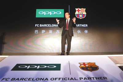 去年9月8日,西甲巴塞羅那俱樂部與OPPO手機(jī)在北京召開聯(lián)合新聞發(fā)布會,宣布自2015-2016賽季開始,OPPO正式成為巴塞羅那俱樂部官方合作伙伴。圖為巴塞羅那俱樂部副主席佩雷斯在新聞發(fā)布會上致辭。