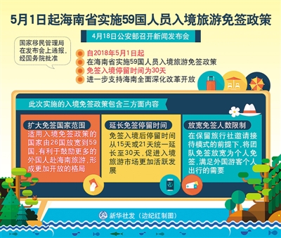 “擴(kuò)大免簽國范圍;延長免簽停留時(shí)間;放寬免簽人數(shù)限制。”4月18日,公安部在京召開新聞發(fā)布會(huì),國家移民管理局在發(fā)布會(huì)上通報(bào):經(jīng)國務(wù)院批準(zhǔn),自2018年5月1日起,在海南省實(shí)施59國人員入境旅游免簽政策,進(jìn)一步支持海南全面深化改革開放。