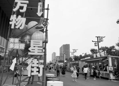 傍晚時分,狹長的夕陽陰影下,太原解放路上白天的悶熱慢慢散去,有了些許清涼。萬達廣場上人聲喧鬧,又是一番火熱景象。以萬達廣場為中心的商圈,是太原城北最繁華的地段。進入6月,萬達廣場前空地上的萬物星街開啟,沿路一字排開的攤位上,商品琳瑯滿目,人流如織,熱鬧非凡。