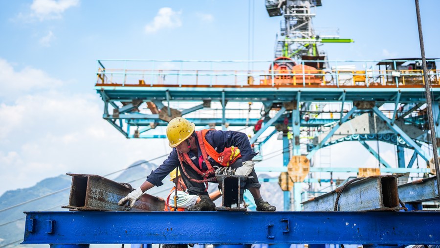 貴州公路集團(tuán)工人在納晴高速牂牁江大橋施工(6月25日攝)。(新華社記者陶亮攝)