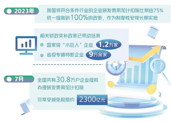 “為切實(shí)保證這一新的惠企政策落實(shí)到位,稅務(wù)部門依托稅收大數(shù)據(jù)篩選符合條件的企業(yè),定向開(kāi)展政策精準(zhǔn)推送和宣傳輔導(dǎo),確保企業(yè)‘知曉政策’;會(huì)同科技部門及時(shí)發(fā)布《研發(fā)費(fèi)用加計(jì)扣除政策執(zhí)行指引2.0》,細(xì)化政策口徑,確保企業(yè)‘會(huì)用政策’;第一時(shí)間優(yōu)化升級(jí)征管系統(tǒng),改進(jìn)電子稅務(wù)局功能,讓納稅人‘足不出戶’即可快捷辦理,確保企業(yè)‘用好政策’?!眹?guó)家稅務(wù)總局新聞發(fā)言人、辦公廳主任黃運(yùn)介紹。從7月份政策落實(shí)情況看,全國(guó)共有30.8萬(wàn)戶企業(yè)提前辦理研發(fā)費(fèi)用加計(jì)扣除,可享受減免稅額約2300億元。