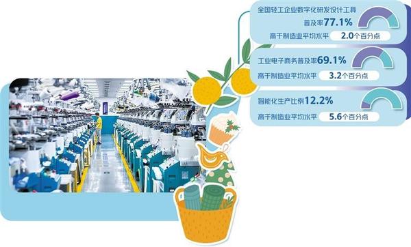 “以輕工業(yè)為例,全國輕工企業(yè)數(shù)字化研發(fā)設(shè)計工具普及率77.1%,工業(yè)電子商務(wù)普及率69.1%,分別高于制造業(yè)平均水平2.0個和3.2個百分點?!蓖跣⒀笳f。