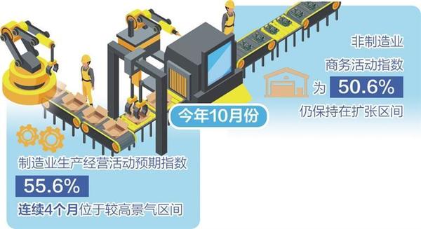 從市場預(yù)期看,10月份,制造業(yè)生產(chǎn)經(jīng)營活動預(yù)期指數(shù)為55.6%,比上月上升0.1個(gè)百分點(diǎn),連續(xù)4個(gè)月位于較高景氣區(qū)間,制造業(yè)企業(yè)對市場發(fā)展信心穩(wěn)定。