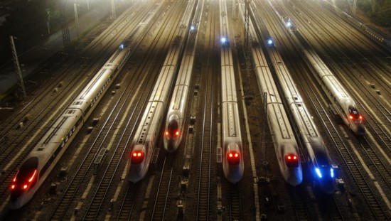 1月26日凌晨,動車組列車??吭趶V州動車段的存車線上(無人機照片)。新華社記者 鄧華 攝