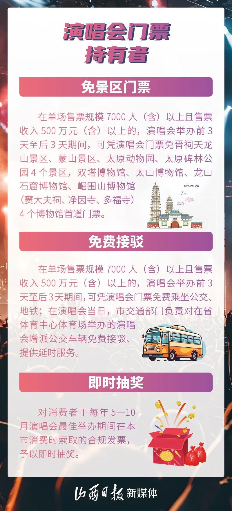 為做大太原市演唱會經(jīng)濟(jì),加快建設(shè)華北地區(qū)重要演藝中心,打造“國內(nèi)外重要文化旅游目的地”,日前,太原市發(fā)展和改革委、市文化和旅游局、市財(cái)政局等11個部門聯(lián)合制定出臺《支持演唱會經(jīng)濟(jì)發(fā)展的若干措施(試行)》。