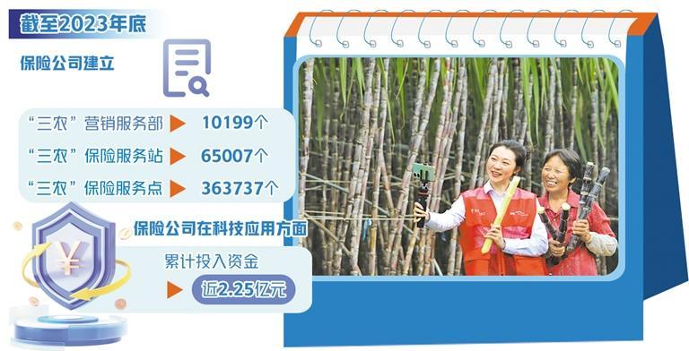 科技的運用也有效推動保險業(yè)服務(wù)農(nóng)村。中國保險行業(yè)協(xié)會發(fā)布的《保險業(yè)高質(zhì)量服務(wù)鄉(xiāng)村振興藍皮書(2024)》顯示,保險業(yè)有效提升了縣域和農(nóng)村機構(gòu)網(wǎng)點覆蓋率,截至2023年底,保險公司建立“三農(nóng)”營銷服務(wù)部10199個,“三農(nóng)”保險服務(wù)站65007個,“三農(nóng)”保險服務(wù)點363737個。2023年,保險公司在科技應(yīng)用方面累計投入資金近2.25億元,主要用于空間信息技術(shù)、AI識別、人工智能、物聯(lián)網(wǎng)等科技手段應(yīng)用,構(gòu)建農(nóng)業(yè)生產(chǎn)、風(fēng)險信息數(shù)據(jù)共享平臺。
