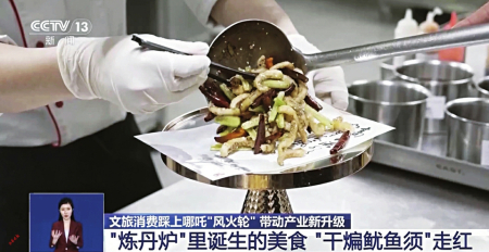 在天津一家酒店的餐廳里,記者看到一份新鮮出爐的“哪吒”菜譜:“太乙手撕雞”“混天綾拌海草”……在這當中,最受食客歡迎的是天津特色菜“干煸魷魚須”,許多游客看到菜單,就會想到說天津話的章魚將軍被天元鼎烤熟的場景。
