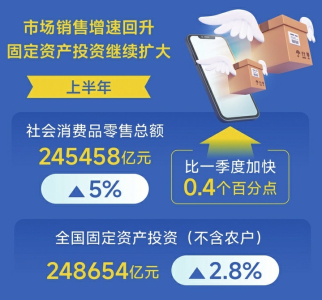 市場銷售增速回升,固定資產(chǎn)投資繼續(xù)擴(kuò)大。上半年,社會(huì)消費(fèi)品零售總額245458億元,同比增長5%,比一季度加快0.4個(gè)百分點(diǎn)。全國固定資產(chǎn)投資(不含農(nóng)戶)248654億元,同比增長2.8%;扣除房地產(chǎn)開發(fā)投資,全國固定資產(chǎn)投資增長6.6%。