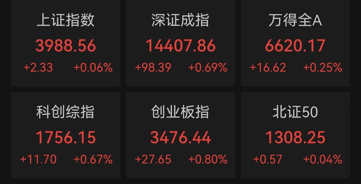 中新網4月13日電(記者 謝藝觀)13日,A股三大股指集體收紅。截至收盤,上證指數漲0.06%,深證成指漲0.69%,創(chuàng)業(yè)板指漲0.8%。盤面上,建材、電腦硬件、基本金屬等行業(yè)板塊漲幅居前。