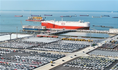 4月27日,搭載7000余輛比亞迪新能源商品車的汽車運輸船比亞迪“深圳”號首航駛往巴西,創(chuàng)下國內(nèi)汽車單次出口量一個批次最多的紀錄。圖為運輸船正在江蘇省蘇州港太倉港區(qū)裝載汽車。計海新攝(人民視覺)