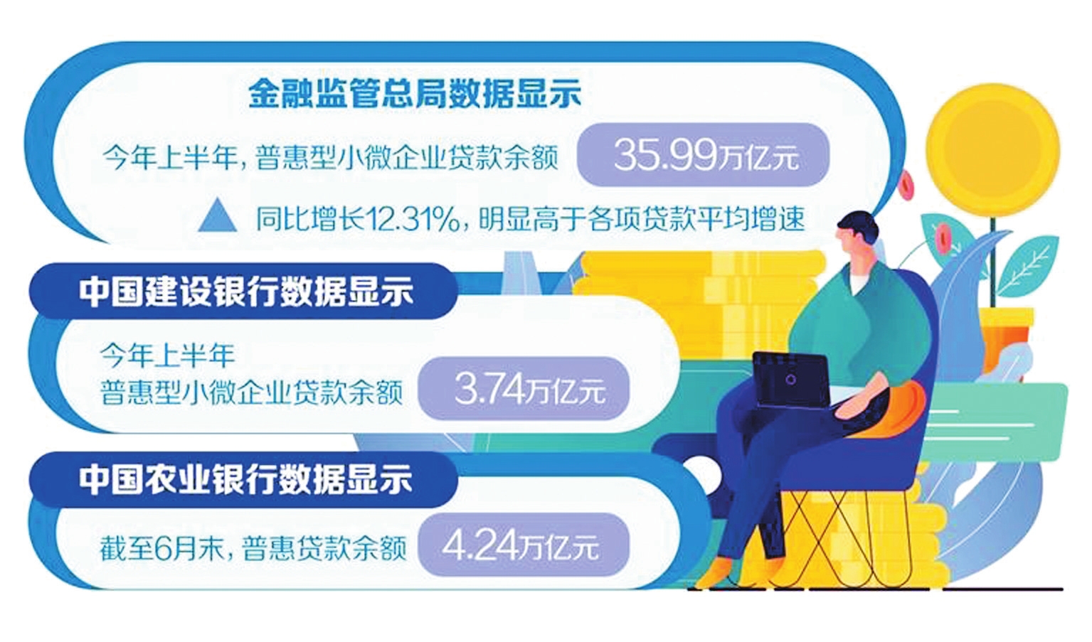 小微企業(yè)是經(jīng)濟(jì)發(fā)展的生力軍、就業(yè)的主渠道、改善民生的重要支撐。金融監(jiān)管總局統(tǒng)計(jì)數(shù)據(jù)顯示,上半年,普惠型小微企業(yè)貸款增長較快,普惠型小微企業(yè)貸款余額35.99萬億元,同比增長12.31%,明顯高于各項(xiàng)貸款平均增速。