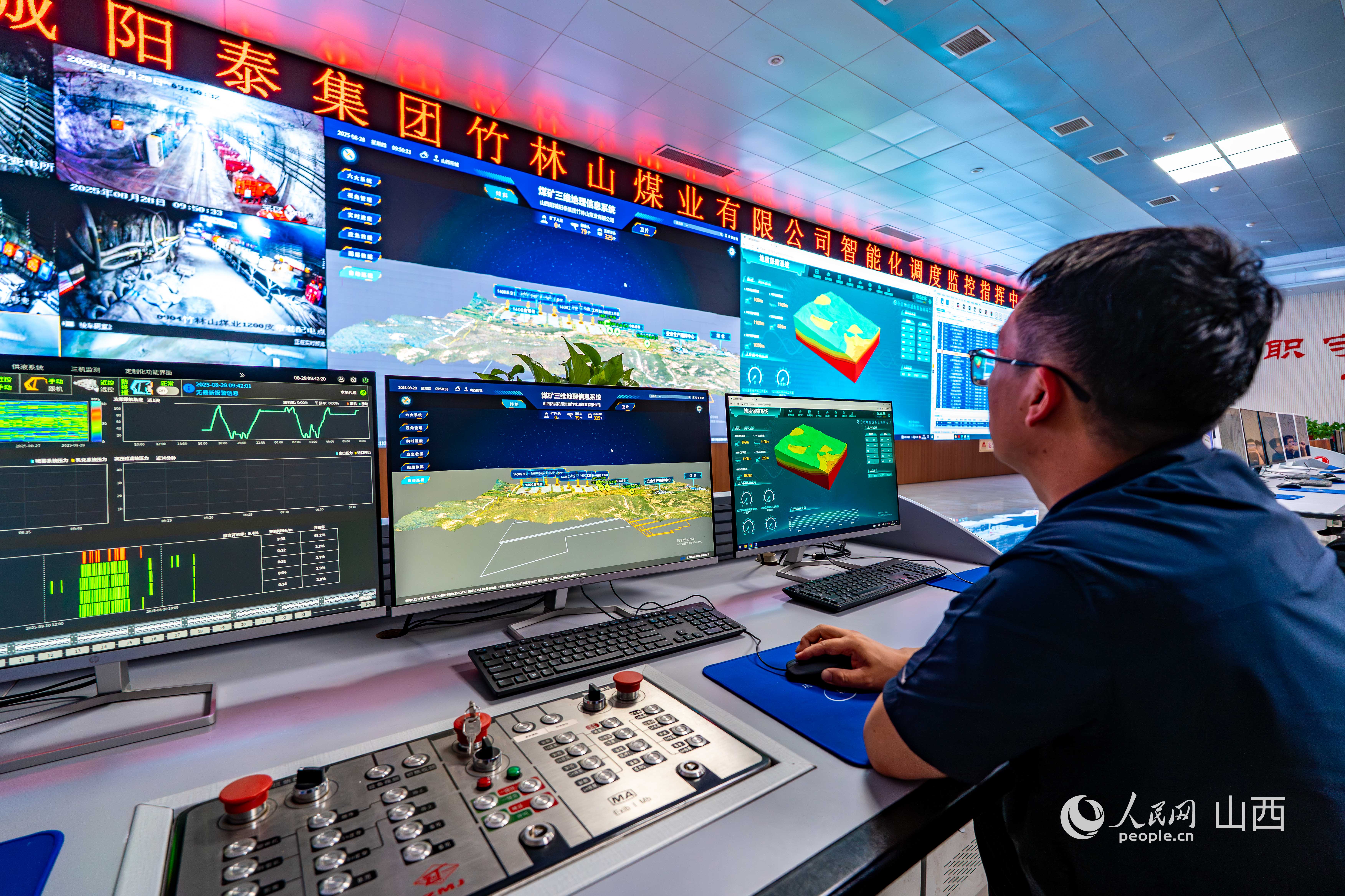 陽泰集團(tuán)竹林山煤業(yè)有限公司智能化調(diào)度監(jiān)控指揮中心。人民網(wǎng) 馬夢(mèng)迪攝