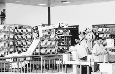2015年,新蘇伊士運河的開通拉動了埃及的制造業(yè)和基礎設施建設。圖為在北非最大的玻璃纖維制造企業(yè)埃及巨石公司,埃及員工與“機械手臂”一同生產的場景。王云松攝