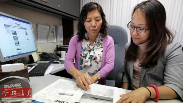 資料圖片:中國影視演員吳姍姍同房產(chǎn)經(jīng)紀人一起查看美國房地產(chǎn)信息(美聯(lián)社)