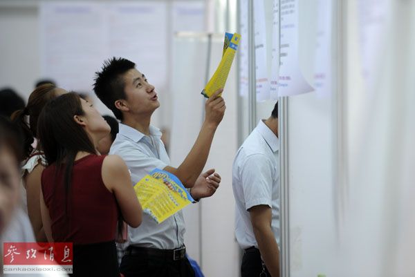 資料圖片:2014年6月15日,求職者在第四屆寧蒙陜甘(銀川)毗鄰城市區(qū)域合作大型人才智力交流大會(huì)現(xiàn)場觀看招聘信息。新華社記者李然攝。