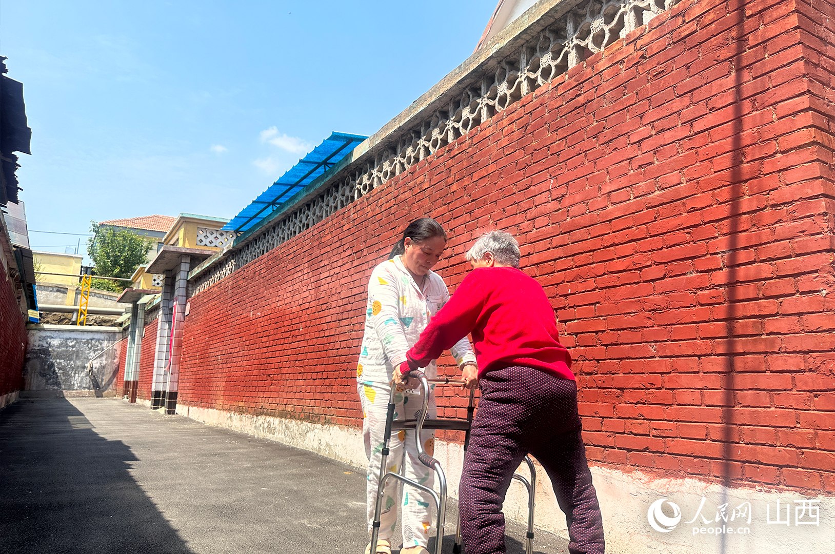 臨近中午,暖陽(yáng)正好。村民李連香正扶著77歲的母親康復(fù)訓(xùn)練。李連香微微將助步器向前移動(dòng),母親跟著緩緩向前。跟母親聊聊小時(shí)候的故事,問(wèn)問(wèn)她想吃什么……一言一語(yǔ)間,母女二人面對(duì)面慢慢移動(dòng)著,走累了,就原地歇一會(huì)。