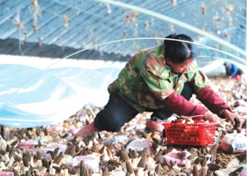農(nóng)戶在大棚里采收羊肚菌。張 媛攝