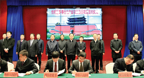 忻府區(qū)領(lǐng)導(dǎo)在簽約儀式上承諾,將繼續(xù)在市委、市政府的堅強領(lǐng)導(dǎo)下,全面推進項目攻堅百日行動,堅持叩門招商、開放包容、鞠親服務(wù),堅決杜絕吃、拿、卡、要,嚴(yán)厲打擊破壞投資環(huán)境的人和事,全力營造親商、安商、富商的良好氛圍。集中人力、精力、財力,服務(wù)、指導(dǎo)、幫扶到位,落實任務(wù)、責(zé)任、措施,促開工、搶進度,攻難點、破難題,強服務(wù)、治環(huán)境,發(fā)揚“白+黑”、“5+2’’、“晴+雨”連續(xù)作戰(zhàn)精神,苦干實干,按照“九個一批”工作方案,全力解決已排查出的涉及現(xiàn)有32個項目中的51個問題,全力策劃好總投資222.16億元的華能風(fēng)光互補發(fā)電、上海航天光伏發(fā)電、北京富丞應(yīng)急救援工程等30個項目,全力促進總投資41.25億元的田森匯生活購物廣場等6個項目落地,全力推進總投資85.8億元的華能風(fēng)電、上海光伏發(fā)電等23個項目的開工建設(shè)。