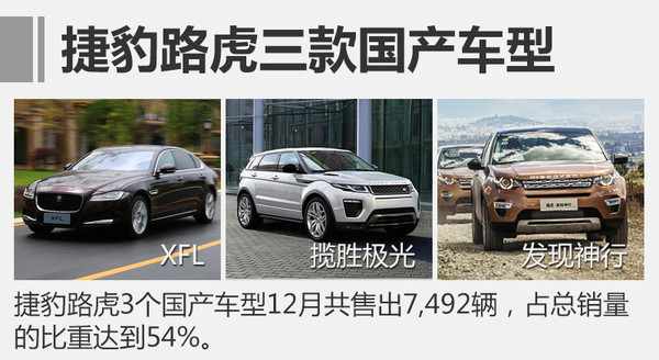 捷豹路虎去年能夠超越自我,實(shí)現(xiàn)新的銷(xiāo)量記錄,國(guó)產(chǎn)車(chē)型成為最重要因素。剛剛結(jié)束的2016年12月,捷豹路虎在華共售出13,859輛,與2015年同期(10,227輛)相比大漲36%。其中,捷豹路虎在華合資公司生產(chǎn)的3款國(guó)產(chǎn)車(chē)型捷豹XFL、路虎極光、發(fā)現(xiàn)神行,12月共售出7,492輛,占總銷(xiāo)量的比重達(dá)到54%。