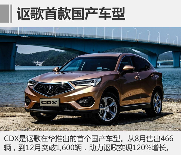 2016年7月,首款國(guó)產(chǎn)車(chē)型CDX正式上市,新車(chē)定位緊湊型SUV,同時(shí)也是謳歌產(chǎn)品體系中級(jí)別最小SUV車(chē)型。CDX上市后逐漸得到市場(chǎng)的認(rèn)可,從8月份的466輛,增長(zhǎng)至11月份的1,110輛,12月更是突破1,600輛。