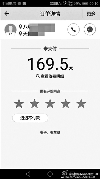 在某網(wǎng)站論壇上,一名順風(fēng)車司機(jī)爆料說,晚上下班后接了一單滴滴順風(fēng)車,想著反正順路,上班路上接一單抵個油費(fèi)也是好的。送到目的地后,自己出于習(xí)慣讓乘客先下車后付款,沒想到對方是用小號注冊的滴滴賬戶,晚飯后再打電話已經(jīng)是“空號”?!斑@顯然是惡意打霸王車啊?!?/p>