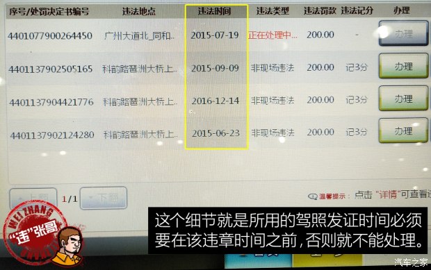 其實這個很好理解,以我這次經(jīng)歷為例。我女朋友拿到駕照的時間是2015年9月份,那她這個駕照就不能用來處理在2015年9月份之前發(fā)生的違章??捎捎谥皼]注意到這個細節(jié),使得自己再次陷入困惑之中。這里給大家一個建議,可以用自己的駕照先把早期的違章處理,這樣周轉的余地就相對大很多了。而粗心的我只能再找其他朋友了,最后總算把分湊齊。