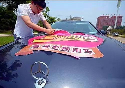 瑪莎拉蒂、路虎、奔馳、寶馬……等十輛豪車在路邊一字排開,每輛車的發(fā)動(dòng)機(jī)蓋上都貼著“高考免費(fèi)用車”的標(biāo)語(yǔ),盡管低調(diào)但車隊(duì)還是吸引了眾人的目光。