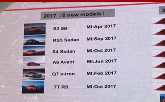 從曝光的產(chǎn)品規(guī)劃來看,2017年奧迪有6款新車上市。到目前為止,奧迪Q7 e-tron和A6 Avant已經(jīng)按照規(guī)劃正式上市。原本計(jì)劃在4月上市的S3 Sportback有望三季度正式投入市場,奧迪RS 3 Sedan在9月上市,而奧迪S4 Sedan與TT RS將于今年10月上市。