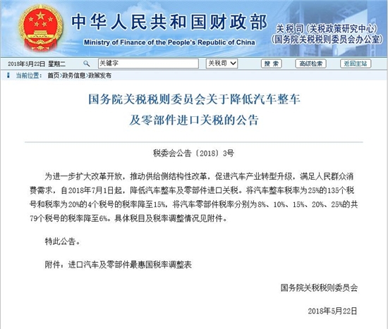 5月22日,國家財政部發(fā)布公告,自2018年7月1日起,降低汽車整車及零部件進口關(guān)稅。將汽車整車稅率為25%的135個稅號和稅率為20%的4個稅號的稅率降至15%,將汽車零部件稅率分別為8%、10%、15%、20%、25%的共79個稅號的稅率降至6%。