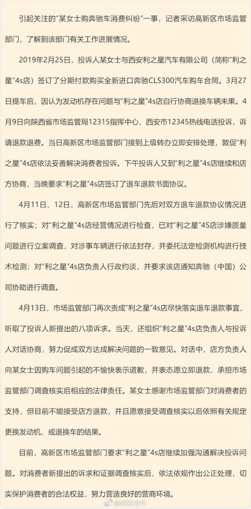 據(jù)西安市互聯(lián)網(wǎng)信息辦公室官方微博消息稱,4月13日,高新區(qū)市場監(jiān)管部門曾組織利之星4S店負責(zé)人與投訴人進行對話協(xié)商。對話中,店方負責(zé)人向奔馳女車主因購車問題引起的不愉快表示道歉,并表態(tài)愿立即退款、承擔(dān)市場監(jiān)管部門調(diào)查核實后相應(yīng)的法律責(zé)任。該奔馳女車主感謝市場監(jiān)管部門對消費者的支持,但目前不能接受店方退款,也愿意接受調(diào)查核實以后依照有關(guān)規(guī)定更換發(fā)動機、或退換車的結(jié)果。