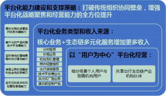 二是平臺化業(yè)務類型和收入來源,除了目前分時租賃、長租外,機構車隊管理、特許經營授權、出行咨詢服務、IT平臺應用商業(yè)化、總分式廣告業(yè)務、會員俱樂部定制化產品等就是產業(yè)鏈收入新來源。
