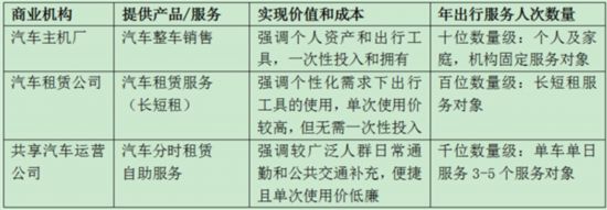 汽車主機廠、租車公司、共享汽車運營公司關于出行的價值特點如下圖所示。