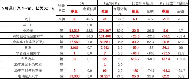 從進(jìn)口額來看,5月汽車進(jìn)口額為46.5億美元,同比增長4.6%;1-5月,汽車進(jìn)口額為197.2億美元,同比下降6.3%。