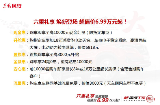 除此之外,為讓新風(fēng)行T5的用戶能夠享受踏實(shí)無(wú)憂的購(gòu)車(chē)、用車(chē)生活,東風(fēng)風(fēng)行貼心準(zhǔn)備六重“禮享”,包括現(xiàn)金惠、升艙惠、置換惠、金融惠、安心惠、流量惠等,力度十足。